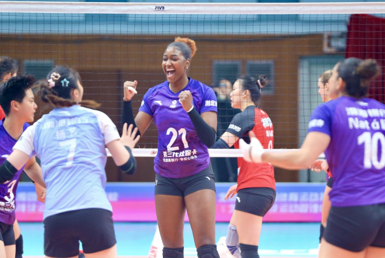 天津女排外援多米尼加副攻马丁内斯(中)与队友庆祝胜利 天津市体育局供图
