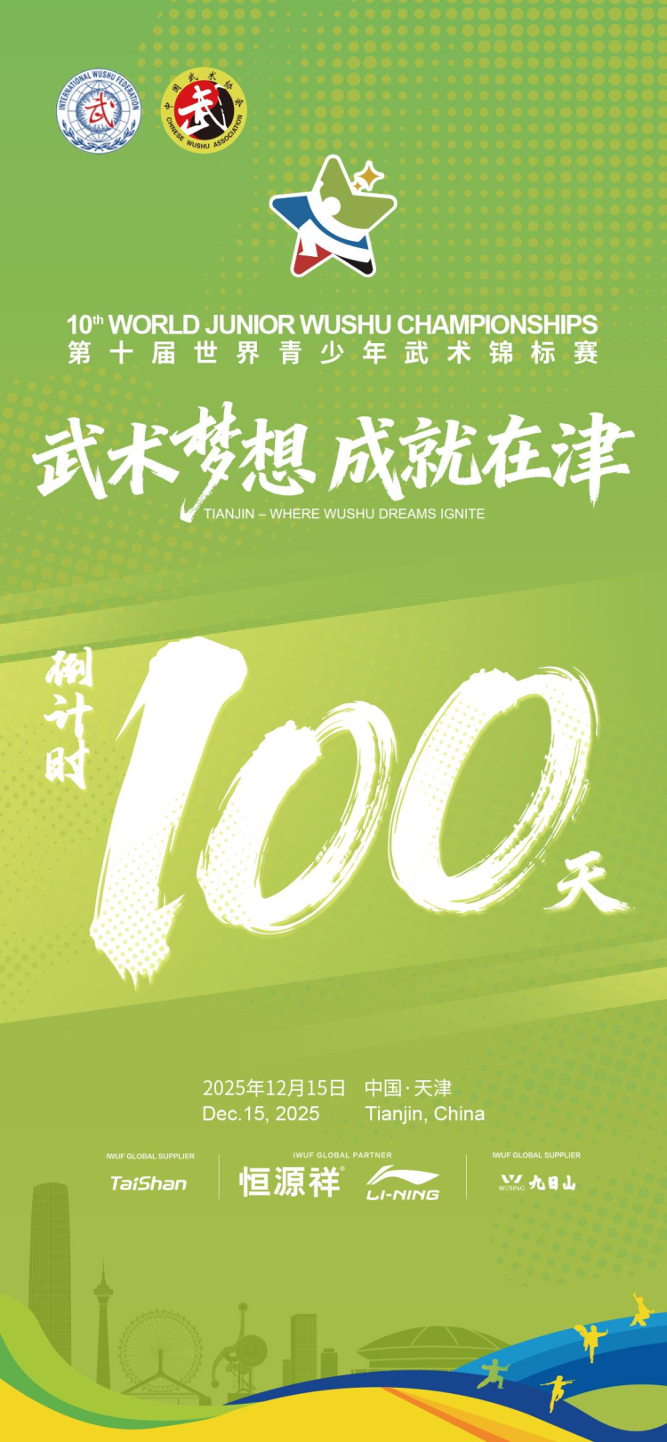 12月15日下午,第十届世界青少年武术锦标赛倒计时100天新闻发布会在天津举行。国家体育总局武术运动管理中心主任、党委书记、国际武术联合会秘书长张玉萍,天津市体育局局长、党组书记薛辉,国家体育总局武术运动管理中心副主任、国际武联副秘书长陈冲,国家体育总局武术运动管理中心副主任、国际武联技术委员会主任李永强,天津市体育局副局长、党组成员李桂峰,天津市体育局二级巡视员陈曦出席活动,共同启动倒计时仪式,发布赛事会徽、奖牌、吉祥物和主题口号等视觉形象核心元素,向全球发出青春武术梦想之约。