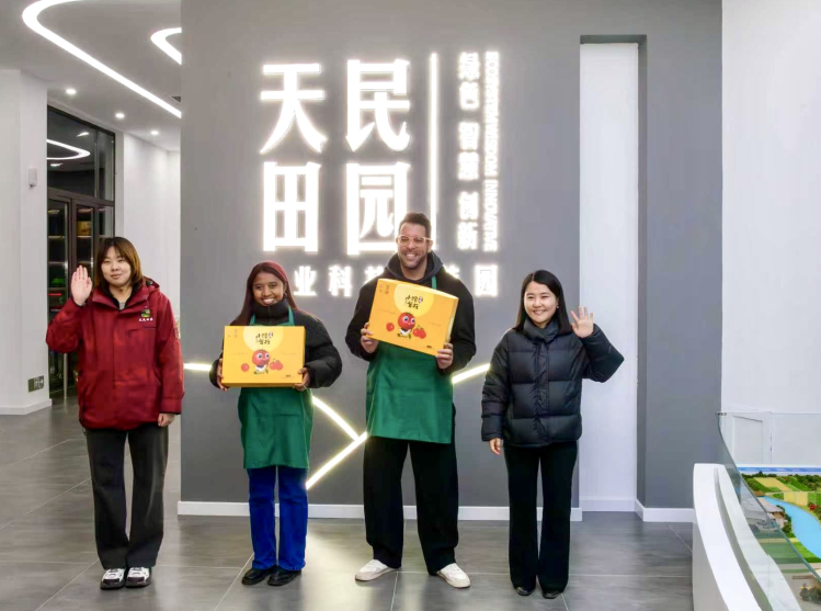 武清南蔡村镇和天民田园工作人员向国际青年赠送“小鹊登枝”番茄并欢迎他们再来体验新农趣