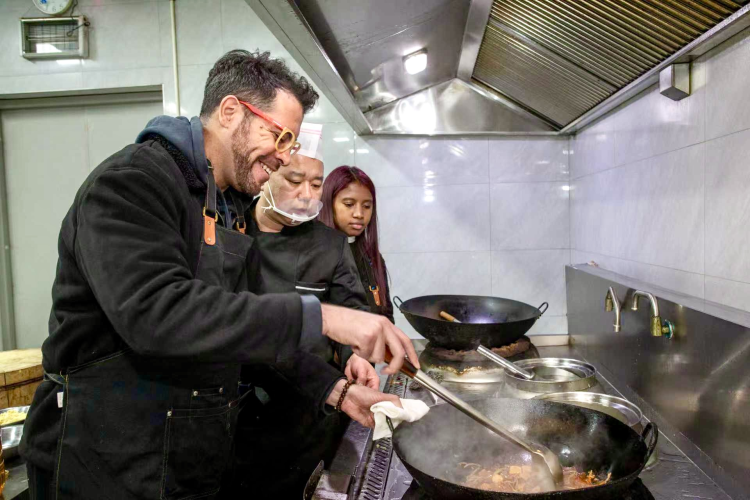 委内瑞拉青年吴瑞龙在师傅的指导下尝试炒制地方特色菜武清素荟