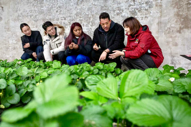 在红颜草莓种植区,物联网监测仪、作物生长调控系统、声波助长仪等设备让青年们目不暇接。工作人员像国际青年介绍道:“熊蜂‘振动授粉’能让雌蕊充分接触花粉,蜜蜂和人工都做不到,还能让果实养分均匀,不用化学药剂,符合绿色有机标准。”