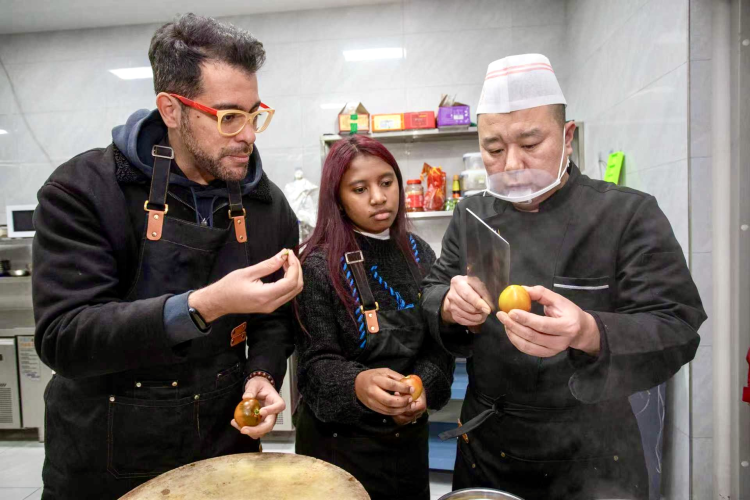 天民田园大运河田园餐厅主厨陈涛(右)向国际青年示范番茄改刀手法