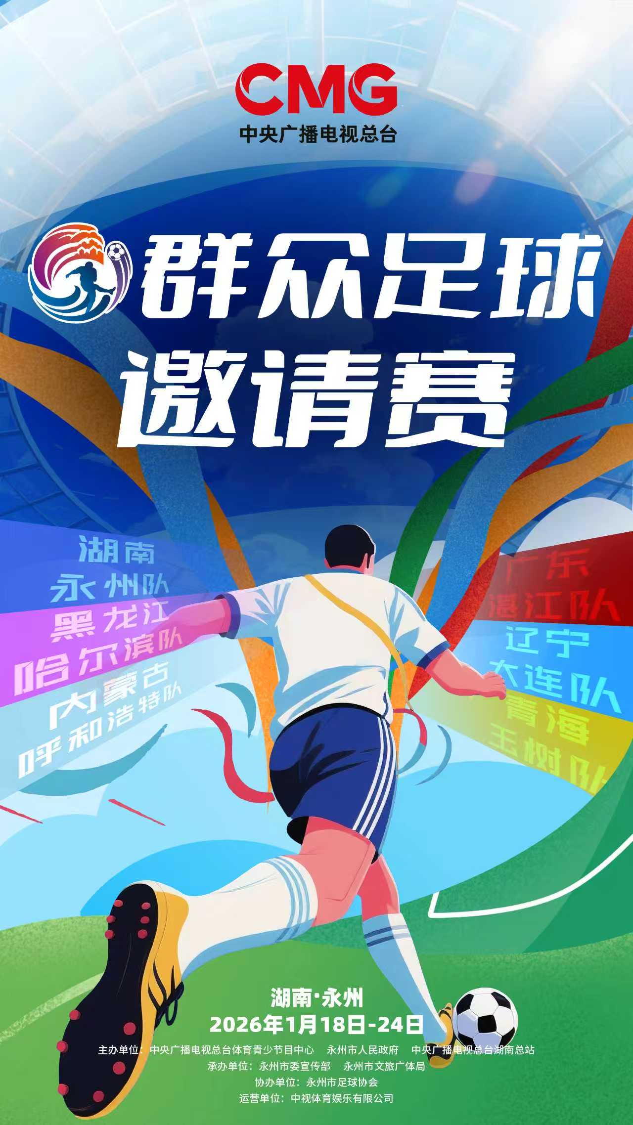 群众足球风云再起,一场汇聚南北、融合竞技与文化的群众足球盛宴即将激情上演。2026年1月18日至1月24日,CMG群众足球邀请赛将在湖南省永州市拉开帷幕。