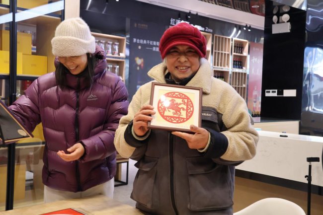 图为市民与获得的剪纸作品合影。董心瑶/摄