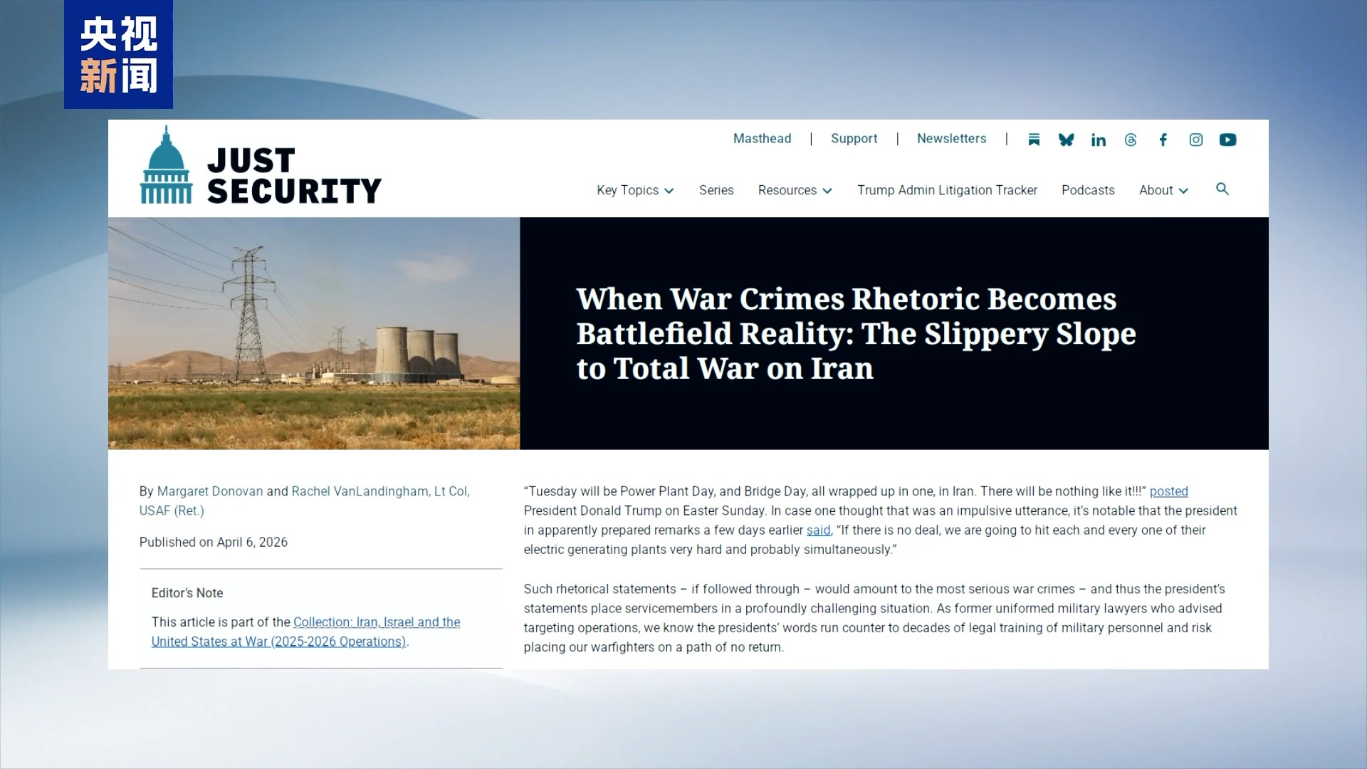 美国前军队律师 雷切尔·范兰丁厄姆:他(特朗普)既是在威胁要犯下战争罪,又在通过这种言论本身犯下战争罪。战争法禁止针对平民采取恐吓措施,包括为了恐吓平民进行暴力威胁。所以仅凭这些言语,他就正在犯下战争罪。如果说我们要轰炸一切,轰炸每一座大桥、每一座为平民服务的发电厂,那就是在威胁要进行无差别攻击。这是最可怕的战争罪行之一,因为它将把我们带入全面战争。