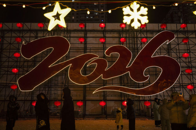 2025年12月31日,“冰城”哈尔滨多处景点灯光璀璨,吸引众多游客前来跨年。新华社记者 张涛 摄