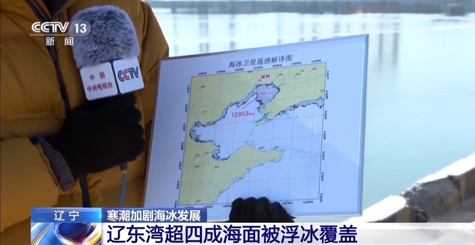 总台记者 季熠非:从自然资源部北海预报减灾中心提供的最新卫星遥感解译图来看,阴影部分是目前辽东湾海冰的分布范围,面积达到了12953平方公里,浮冰距离海岸的最大外缘线达到58海里,也就是107公里以上,超过42%的辽东湾海面,现在被浮冰覆盖。