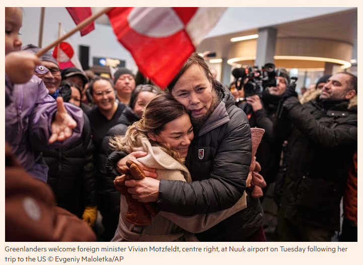 1月20日,格陵兰岛自治政府外交部长薇薇安·莫茨费尔特从华盛顿返回时,上百民众在积雪的机场道路旁迎接她,支持她在华盛顿发表的声明:格陵兰岛不会成为美国的一部分。