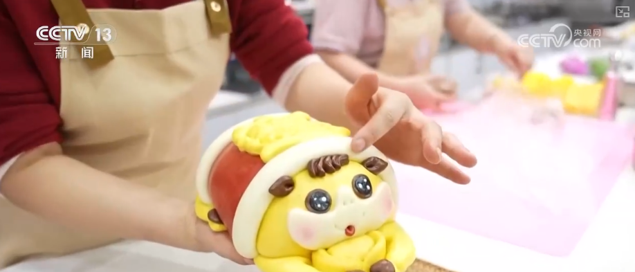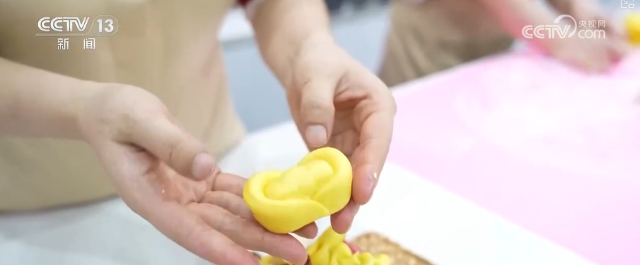 面点师杨晓兰介绍,这一款是“发财马”,别看它小小一个,里面还有小惊喜。这里面有8个“金元宝”,是为了讨一个好彩头,年夜饭大家围在一块儿吃饭,抢这个“元宝”寓意特别好。