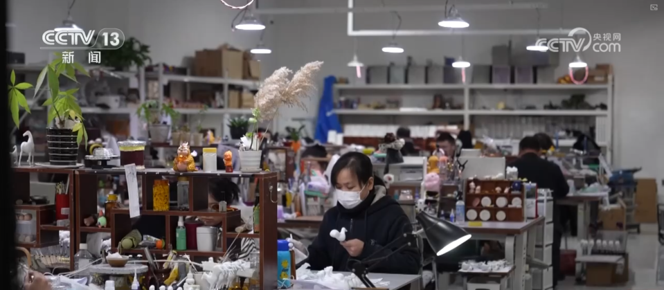 加上毛发,这一款精致的“潦草小马”就终于完工了。在记者身旁是“马彪彪”团队的工作室。春节临近,三十多位工作人员正在全力以赴地赶制订单中。