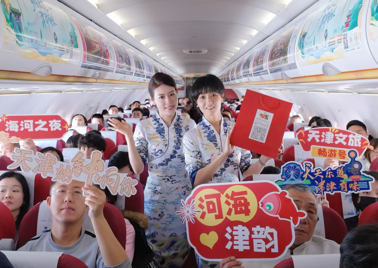 “天津文旅畅游号”的启航,是天津航空将航空载体与城市文旅深度绑定的创新实践。天津航空将原有的“天天乐道 津津有味”主题彩绘飞机进行全新升级,与天津市文旅局联合打造这架极具城市辨识度的“天津文旅畅游号”。这架飞机不仅机身涂装有津门、津塔、天津之眼等极具天津代表性的文化景观和建筑的手绘设计,还在客舱内部的行李架、小桌板等贴有天津著名的文旅打卡地标,为旅客打造了沉浸式的天津文旅特色体验。