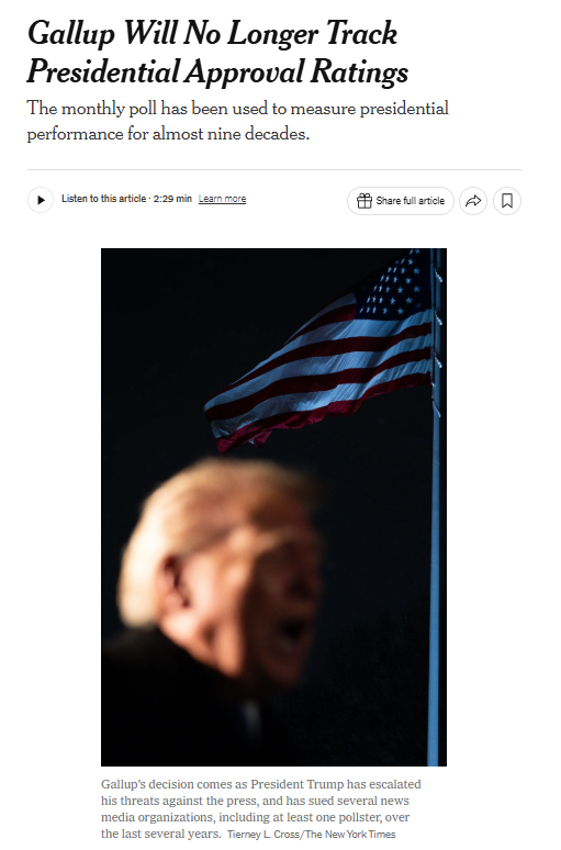 《纽约时报》网站近日刊文称,美国著名民调机构盖洛普将停止追踪总统的支持率。