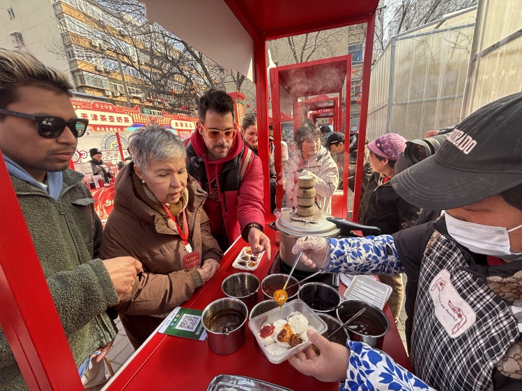 除了“逛吃”,互动体验项目也是本次市集亮点。投壶游戏吸引不少市民尝试,现场不时传出欢呼声和笑声;漆扇制作区里,游客在工作人员的指导下,将选好颜色的颜料依次滴入清水中,慢慢划动出喜欢的图案,制作出专属新春纪念品。在书法体验区,在天津生活十年的委内瑞拉青年吴瑞龙坦言,自己早已习惯本地年俗——贴春联、吃饺子、看春晚,样样不落。作为西北角的“常客”,他最钟爱的早点是一套热乎的煎饼果子。“每次来西北角都有新发现,过年就是要热热闹闹的,才有年味!”举着刚写好的“福”字,吴瑞龙笑着说道。