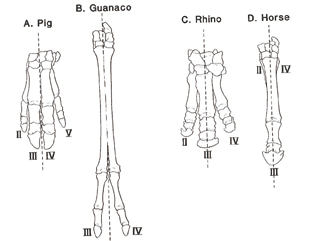 △偶蹄(A.猪、B.原驼)和奇蹄(C.犀牛、D.马)类动物脚的重心示意图(MacFadden,1992) 精品推介----中国科学院古脊椎动物与古人类研究所