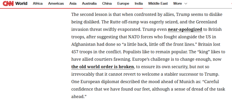 在慕安会开幕前夕,美国有线电视新闻网2月12日的报道说,旧的世界秩序已然崩塌,欧洲面临的挑战是:做出足够的改变以保障自身安全,但又不能彻底同美国决裂。报道直言:“就目前而言,欧洲几乎别无选择。在这场一切看似岌岌可危、却鲜有实际行动的漩涡中,维持欧美关系现状大体不变,或许就已经算是足够的胜利。”