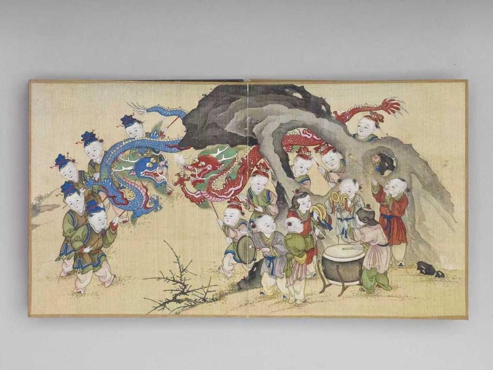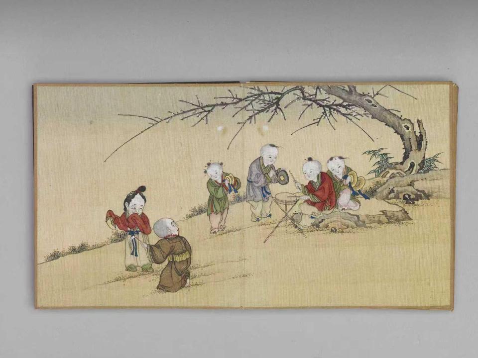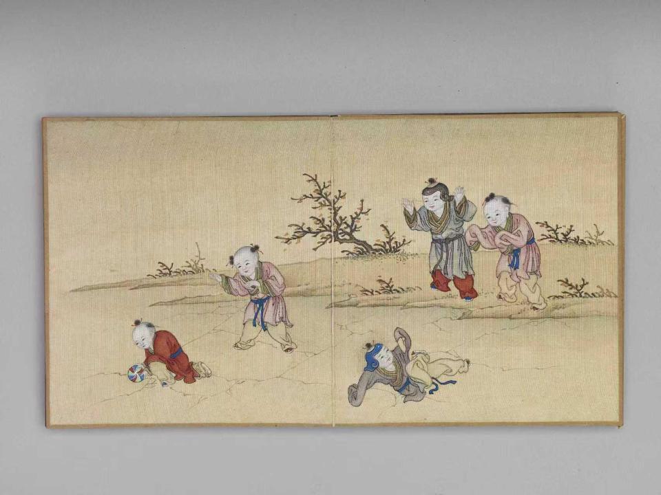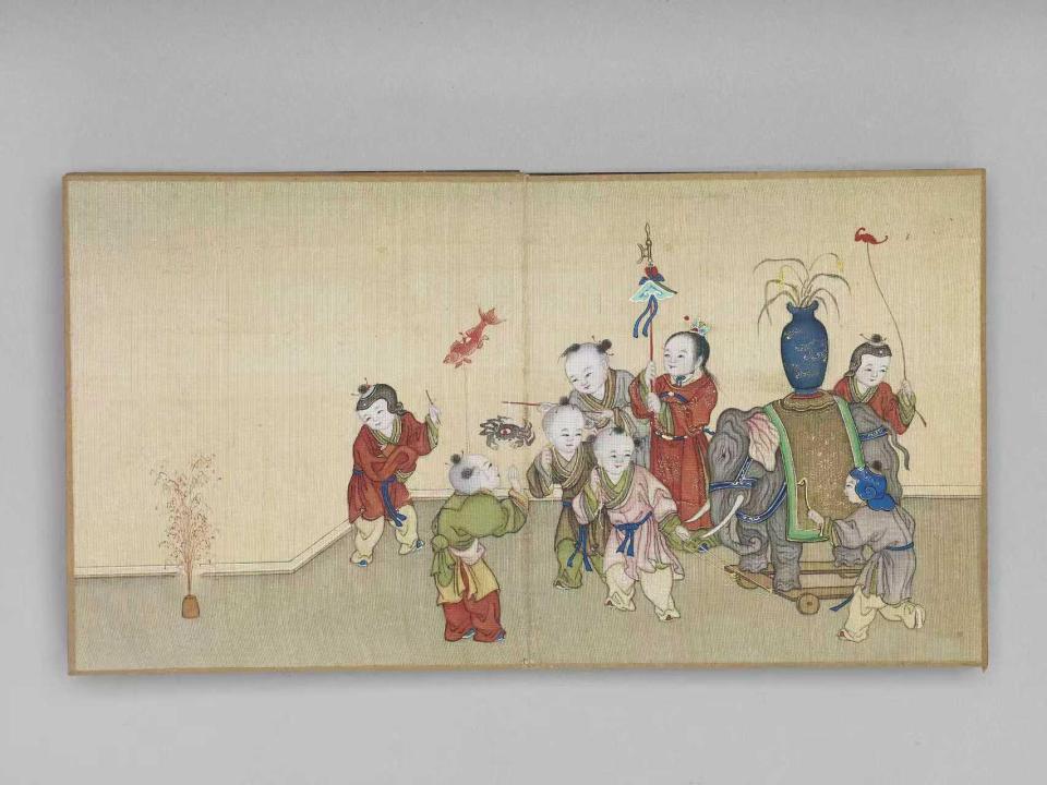 《岁华集庆》册页里,藏着最热闹的新春童趣。孩童们或推“太平有象”玩具,或点爆竹,或跑竹马,或舞龙竞技,每一种游戏都是春节的“吉祥符号”。小小的册页,把百子嬉游与新年庆祝相结合,满是喜庆。