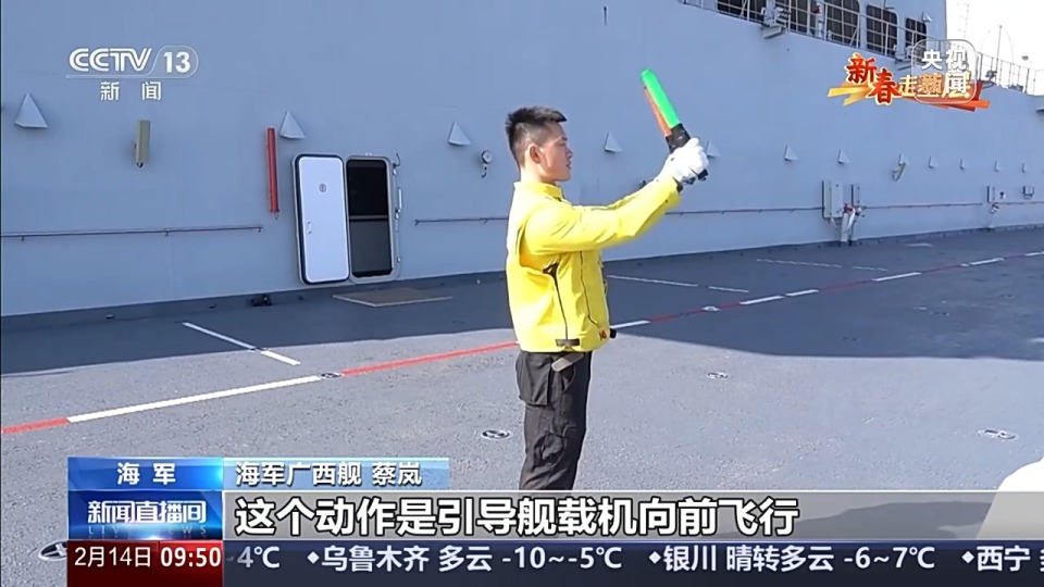 海军广西舰 蔡岚:我们进行的是舰载机起降保障训练。训练的核心目标是实现起飞、回收、再起飞的高效衔接,重点就是练我们和飞行员之间配合的默契度和协同的能力,提高放飞效率。