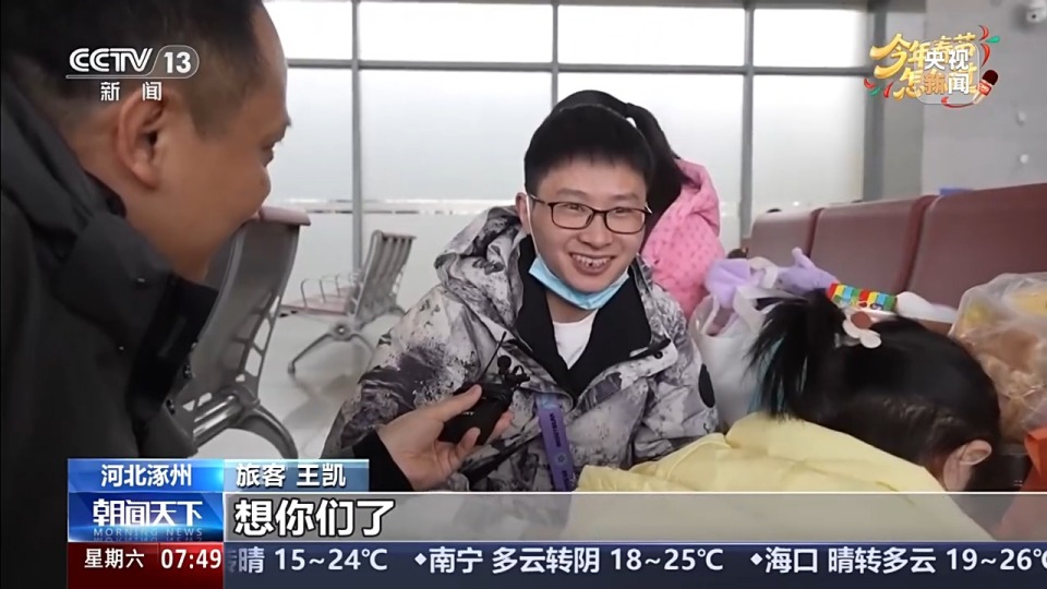 旅客 王凯:春节对我们这种游子来说就是一年一次的团聚时间,靠春节假期回家和家人团聚,聊聊家常、吃吃团圆饭。两年没见面了,高兴啊。想对爸妈说,想你们了,最想说的是想你们了。