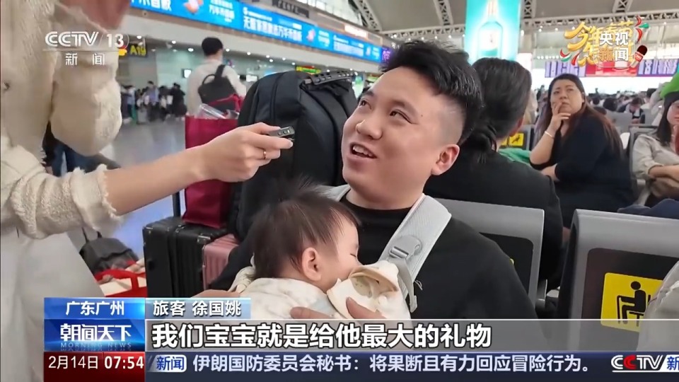 江西旅客 徐国姚:已经有两年没回家了,好久没看到父母亲了,我爸也70多岁了,早点回家。我们宝宝就是最大的礼物,他一直盼望着我们早点回家。准备开年后买辆车,买六座的。现在有宝宝的话,我觉得带上丈母娘、父母,我们出去玩就比较舒服一点。今年好好努力一下,等宝宝大的时候就买下来。有了宝宝之后变成一个父亲,收获还是蛮多。第一就是有责任感了,我觉得真的不一样了,更有期待、更长远的去看待未来。