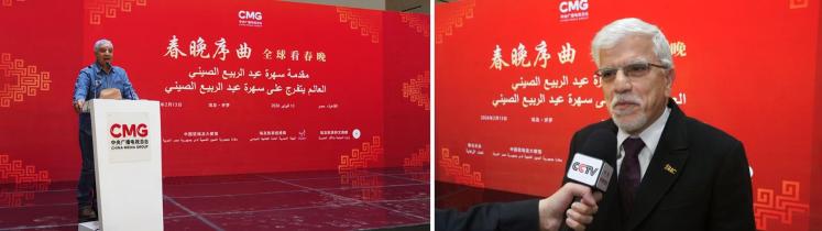当地时间2月13日,“春晚序曲 全球看春晚”埃及专场活动在开罗举行。本次活动由中国中央广播电视总台与中国驻埃及大使馆、埃及旅游和文物部、埃及旅游促进局共同主办。中宣部副部长、中央广播电视总台台长慎海雄作视频致辞。中国驻埃及大使兼驻阿盟全权代表廖力强,埃及政府代表、埃及外交部亚洲事务部助哈姆扎,埃及前总理沙拉夫出席活动并致辞。埃及考古学家、前文物部长哈瓦斯,埃及旅游促进局主席代表拉提芙,埃及外交事务委员会执行主任伊扎特,巴德尔大学副校长巴斯欧尼,阿盟非洲事务司司长布斯坦吉,阿盟理事会秘书处主任法赫米等中埃两国政界、学术界、媒体界代表200余名嘉宾参加活动。