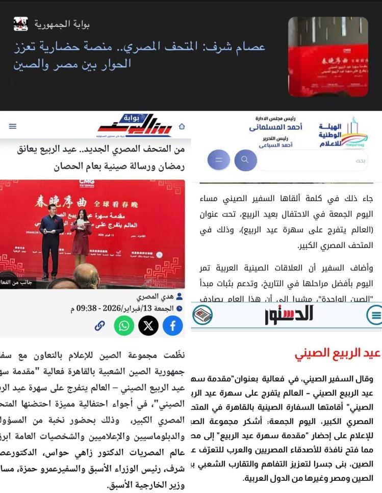 与会嘉宾一致认为,本次活动以春晚为文化载体、以“马”为精神纽带,生动展现中埃两大古老文明对生命力量、进取精神与崇高信仰的共同礼赞,有力促进两国文明交流互鉴、深化人文交融。埃及考古学家、前文物部长哈瓦斯表示,埃中两大文明历史悠久、底蕴深厚,均以珍视文化传统、重视文物保护著称。期待双方进一步深化文化和旅游领域合作,持续推动两大文明互学互鉴、携手同行。埃及巴德尔大学副校长巴斯欧尼表示,埃中两国同为文明古国,在诸多文化理念上高度契合、相通共鸣。期待未来两国各领域合作不断拓展,携手实现共同发展、共同繁荣。