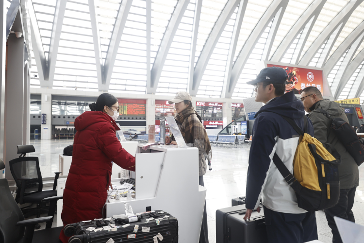 正值春运,天津西站内旅客络绎不绝。在二楼候车大厅北侧,北京大兴国际机场天津西站城市航站楼正为往来旅客提供着特别的便利——在这里,乘客前往大兴机场乘机,可提前办理值机并托运行李,“轻装”去往全国各地。