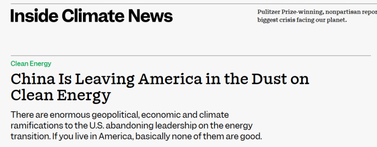 2月14日,美国环境新闻网站“内部气候新闻网”(Inside Climate News)刊文称,中国在清洁能源领域正将美国远远甩在身后。美国放弃能源转型领导地位将引发深远的地缘政治、经济与气候连锁反应,对自身几乎有百害而无一利。