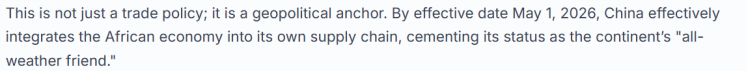文章说,在美国频繁干预非洲内部事务、欧洲在对非贸易政策上犹豫不决之时,中国坚定推动加强与非洲的经贸合作。自2026年5月1日相关措施实施起,中国将有效地将非洲经济纳入自身供应链,进一步巩固其作为非洲“全天候朋友”的战略地位。