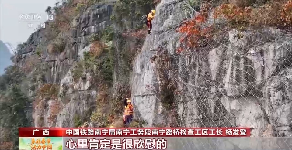 为了保障春运期间,铁路线安全畅通,中国铁路南宁局集团有限公司南宁工务段的工作人员,抢抓铁路“窗口期”,在杂草丛生的山间小路上艰难前行、在悬崖峭壁上双手双脚并用攀爬,勘察铁路沿线山体上的岩石状态,处理可能影响到铁路安全的危石。
