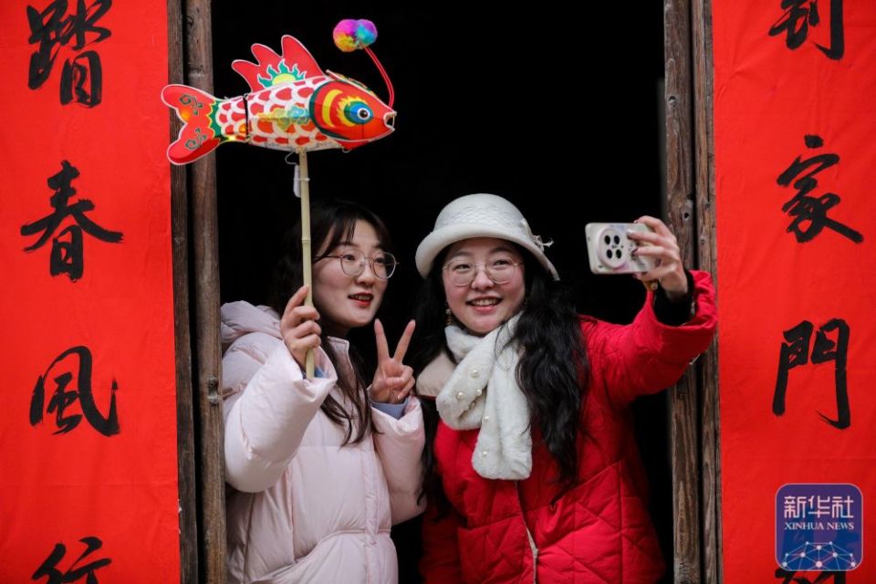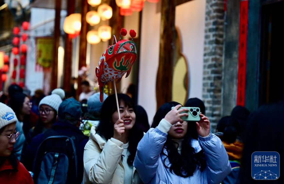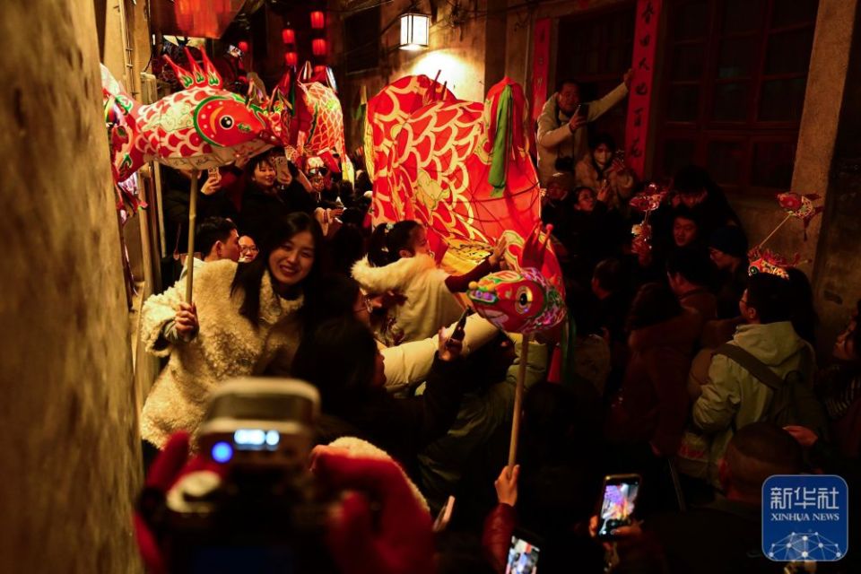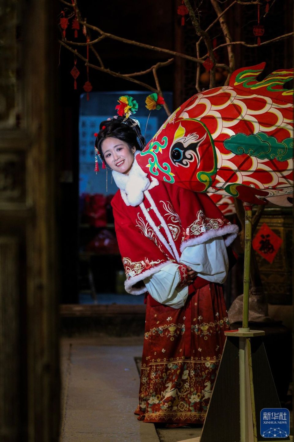 2月7日,游客在瞻淇村里体验鱼灯表演。