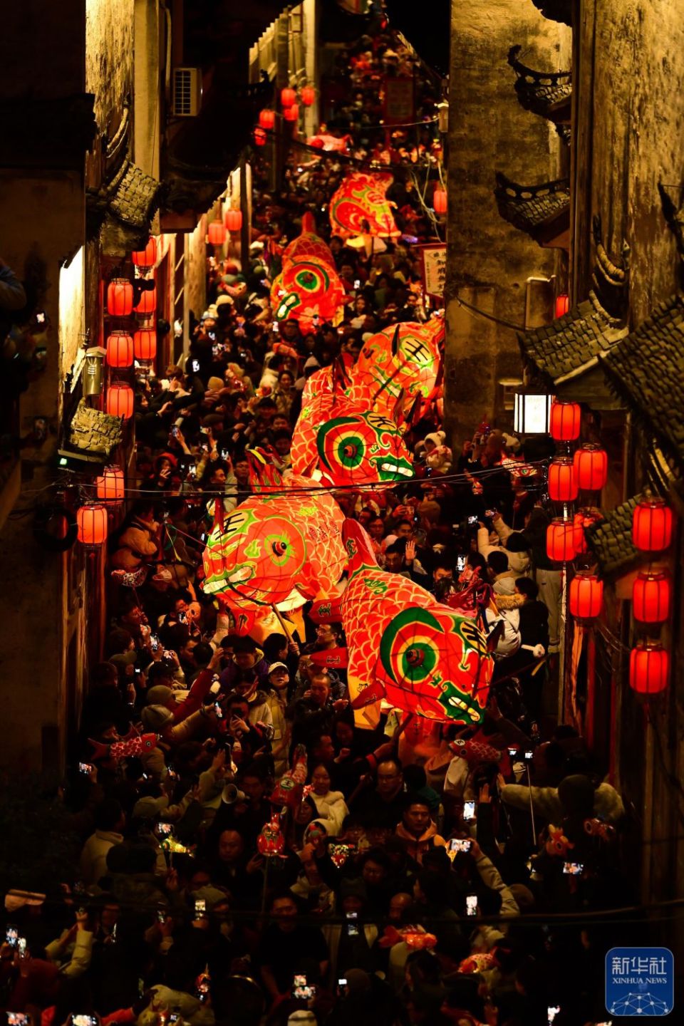 2月7日,瞻淇村鱼灯队在村中表演(无人机照片)。