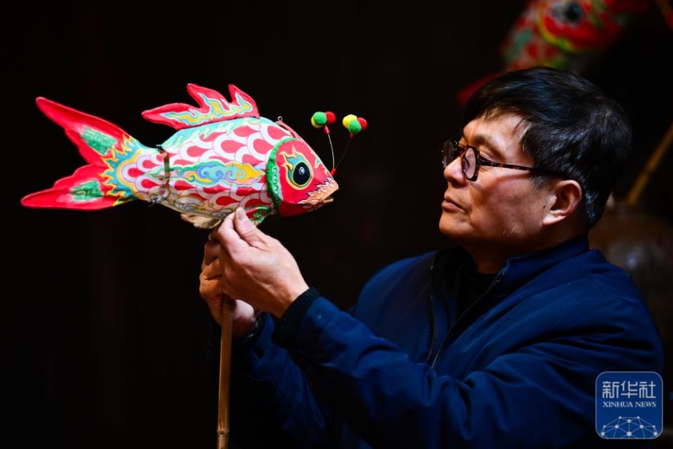1月29日,瞻淇村的县级非遗项目瞻淇鱼灯代表性传承人汪卓荤在制作鱼灯。