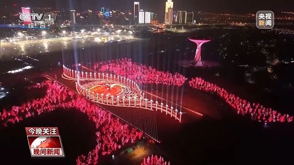 夜幕降临,三江口璀璨灯火与无人机秀点亮夜空,各地游客欢聚长江之畔,年味十足。