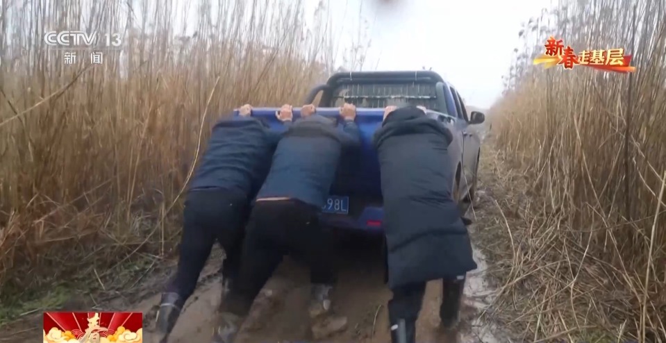 无人机画面里,一只国家二级保护动物小天鹅被困水中。陈新凯立刻带队赶去,可途中的一场雨,把乡间土路泡成了泥潭,车子陷了进去。