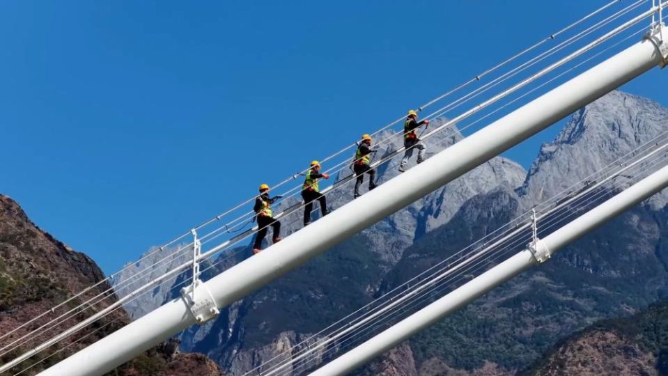 春运期间,国铁昆明局广通工电段新尚桥路工区的守护者们定期对虎跳峡金沙江铁路大桥进行“体检”,他们被誉为“雪山飞狐”。