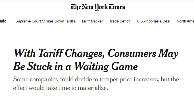 美国《纽约时报》2月20日发表的文章说,美国最高法院否决特朗普政府多项关税的裁决,让消费者们欢欣鼓舞——他们期待进口商品价格能应声下跌。但经济学家警告,商家不会立即调低标价。只要关税政策仍存变数,那些为转嫁成本而涨价的企业必然持观望态度。更棘手的是,就像此前被废除的关税一样,新出台的10%全面关税仍可能被转嫁给消费者