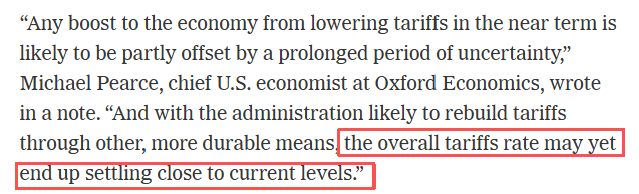 牛津经济研究院美国首席经济学家迈克尔·皮尔斯指出:“短期降关税对经济的提振,很可能被长期不确定性部分抵消。鉴于政府可能通过更持久的手段重建关税,整体税率最终或与当前水平相差无几。