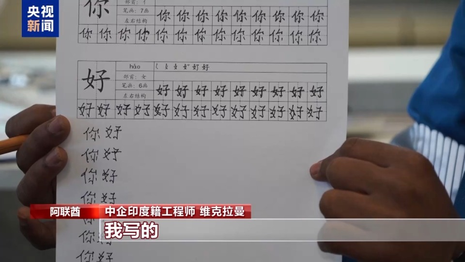 为了更好地与同事交流,维克拉曼一有空就抓着中国同事用中文聊天。在码头的职工中文课堂里,中文老师正在教写“马”“福”“春”等汉字。维克拉曼饶有兴致地提笔练习,并向记者展示了他每日坚持练习的字帖,以及因为表现积极获得的小礼物。