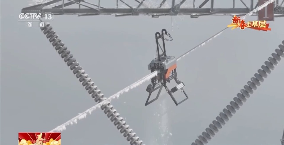 不断旋转的履带,是它的双脚。它一边快速向前,一边挤压导线上的覆冰。1分钟左右,20多米长的导线,覆冰全部被清理干净。
