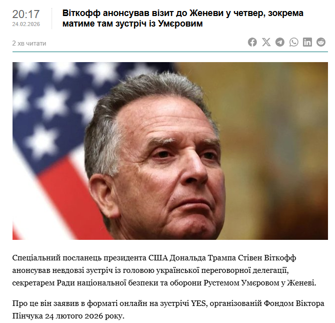 当地时间24日,美国总统特使威特科夫宣布26日将访问日内瓦,并将与乌克兰国家安全与国防委员会秘书、乌谈判代表团负责人乌梅罗夫会面。