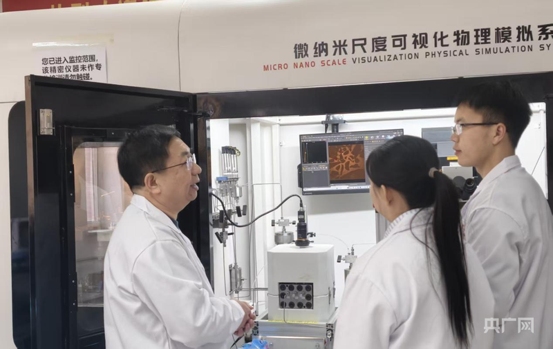 吴景春(左一)与团队成员正在讨论页岩油采收技术(央广网记者 陈显春 摄)