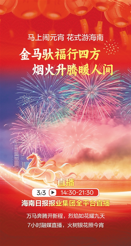 3月3日14时30分至21时30分,海南日报报业集团将联动海南省各市县融媒体中心,推出2026年海报集团“马上闹元宵 花式游海南”融媒体大型直播,邀您赏琼剧古韵,探琼岛民俗,看机器人跳竹竿舞,听AI狗“唤”花说民俗……传统与新潮碰撞,烟火与科技交融,来赴一场“科技+民俗”的元宵奇妙夜。