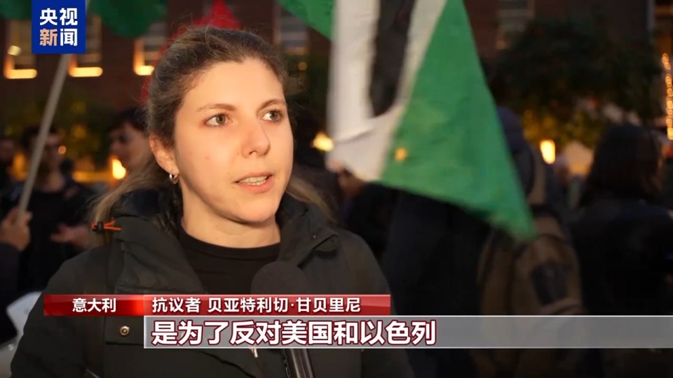 抗议者 贝亚特利切·甘贝里尼:我们站在这里,是为了反对美国和以色列对伊朗发动的侵略。我们反对战争、反对帝国主义。
