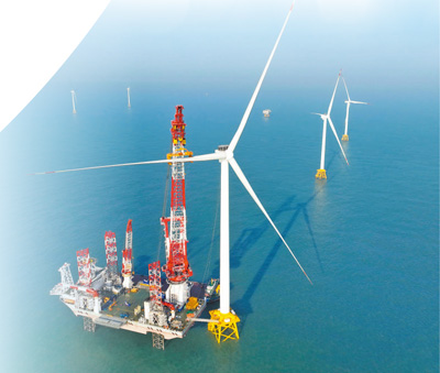 | 位于福建闽南海域的“大桥海风”号2000吨自升式海上风电安装平台和20兆瓦风电机组吊装现场俯瞰。 新华社记者 林善传摄 |