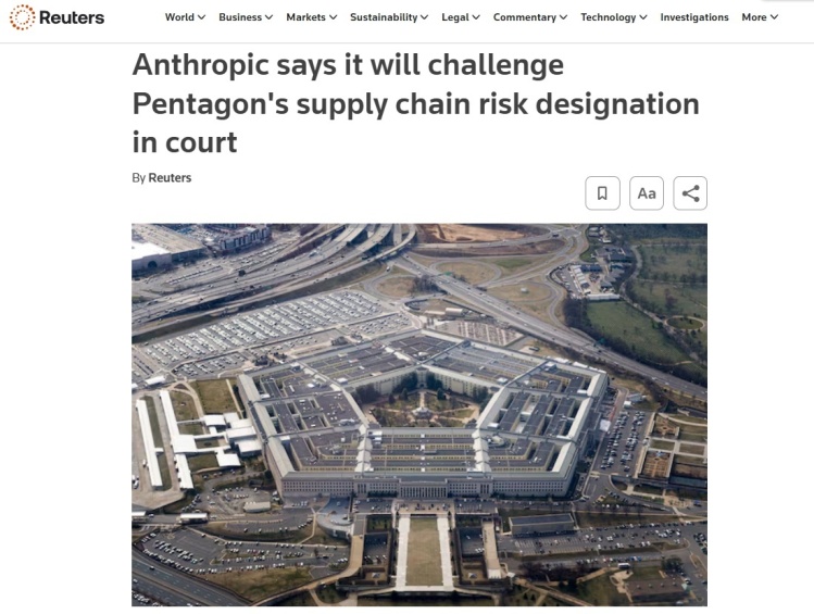 据英国媒体近日报道,美国初创AI企业Anthropic公司日前表示将就五角大楼将其列为“供应链风险”的决定提起诉讼。2月27日,美国总统特朗普下令美国政府停止使用人工智能公司 Anthropic的产品,五角大楼随即宣布该公司构成国家安全风险。