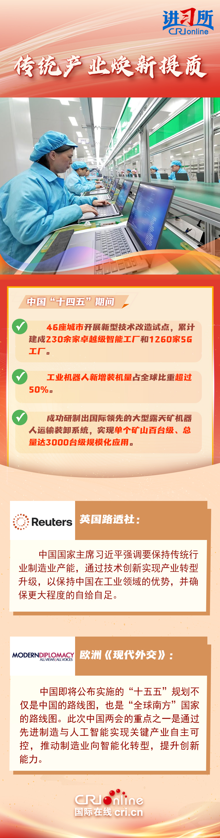 回望“十四五”时期,中国传统产业焕新提质,新兴产业集群崛起,未来产业厚积薄发,产业升级与创新发展取得显著成效。国际舆论认为,中国正成为引领未来发展的重要力量,将对全球新一轮科技革命和产业变革产生深远影响。