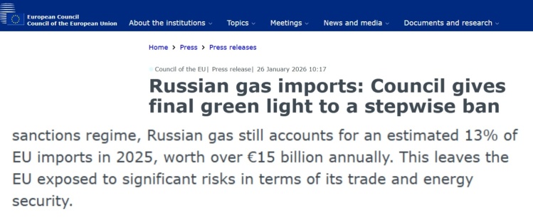 欧盟27个成员国1月26日正式通过关于逐步禁止从俄进口管道天然气和液化天然气的法规。对从俄进口液化天然气的全面禁令将于2027年年初生效,对进口管道天然气的全面禁令将于2027年秋季生效。2025年,俄天然气约占欧盟进口总量的13%,价值超过150亿欧元。