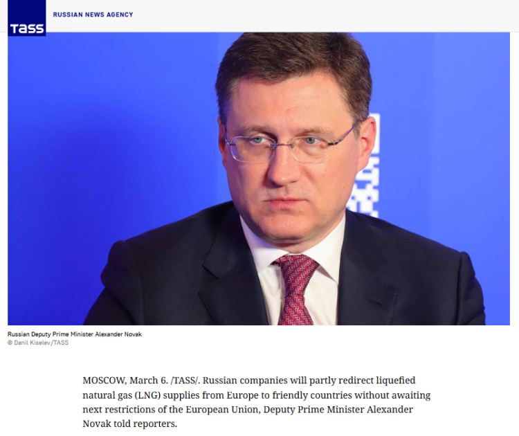 当地时间3月6日,俄罗斯副总理诺瓦克表示,俄罗斯企业近期将把部分供应欧洲的液化天然气转向其他有需求的国家。