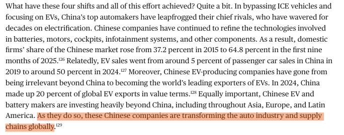 在具体产业方面,报告特别提到,中国在一些新兴领域已经取得具有全球影响力的成果。其中,电动汽车产业的发展尤为突出。中国企业在动力电池、整车制造以及供应链整合等方面形成了完整产业体系,不仅推动国内新能源汽车市场快速增长,也在一定程度上改变了全球汽车产业的竞争格局。报告认为,中国企业在电动汽车技术和生产规模方面展现出的优势,使其成为推动全球能源转型的重要力量之一。