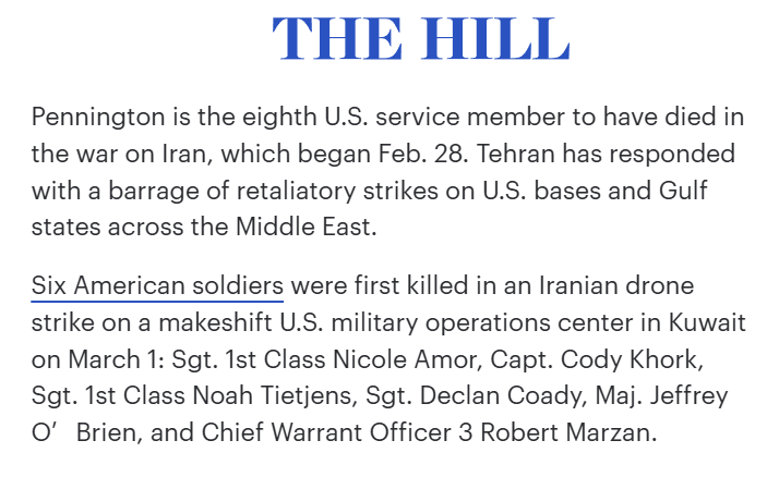 美国《国会山报》网站3月9日报道,美方已证实在此次冲突中第八名阵亡的士兵。